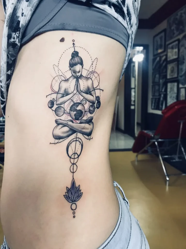 A seated meditator tattoo often serves as a representation of connection to Buddhism, yoga, and other spiritual practices, symbolizing calm and balance. For many, it holds deep mental health meaning, encouraging being present in the moment despite ongoing struggle or anxiety.