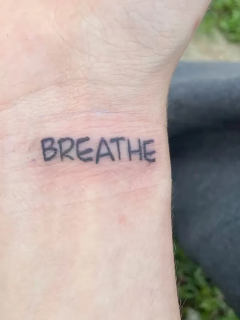 A well-placed text tattoo like “Breathe” serves as a powerful reminder to focus during moments of panic attack or when feeling overwhelming emotions. This simple yet effective design helps regain a sense of control over the body and mind.